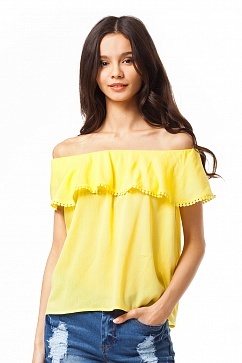 Игривый летний топ свободного силуэта выполнен из тонкой вискозной ткани. Горловина дополнена драпированная оборкой. Верх изделия на резинке позволяет носить его спущенным, открывая линию плеч.