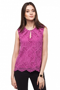 Нежный кружевной топ с фигурным краем - прекрасный вариант для создания женственного образа. Изделие выполнено из плотного кружева на трикотажной подкладке из полисвискозы. Спереди вырез-капля с застежкой на пуговицу.