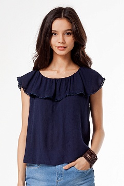 Игривый летний топ свободного силуэта выполнен из жатой вискозной ткани. Горловина дополнена оборкой. Верх изделия на мягкой резинке позволяет носить его спущенным, открывая линию плеч.