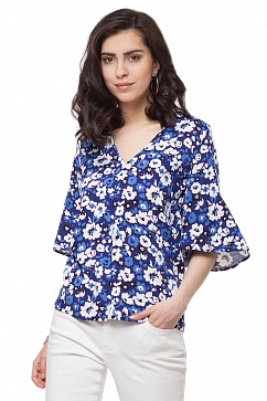 Блуза из фактурного вискозного полотна с трендовым синим цветочным узором. Свободный фасон изделия идеально подходит для летнего гардероба. Глубокий V-образный вырез и широкие, летящие рукава-клеш, сзади застежка на пуговицу.