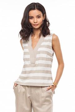 Топ выполнен из плотного вискозного полотна с фактурой под лен, в широкую красно-белую полоску. Вырез горловины V-образной формы обработан широкой обтачкой с закрепкой на линии груди. Удлиненная спинка, низ бокового шва с разрезом.