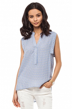 Блузка свободного силуэта выполнена из фактурного вискозного полотна с геометрическим принтом. Удлиненная спинка, разрезы в боковых швах. Спереди планка на пуговицах с V-образным вырезом. Пуговицы из натурального перламутра.