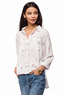 Блузка свободного силуэта со спущенным плечом изготовлена из тонкого вискозного полотна с оригинальным молодежным принтом. Классический отложной воротник, застежка на планку на пуговицах. Накладные карманы. Удлиненная спинка с широкой двойной кокеткой.