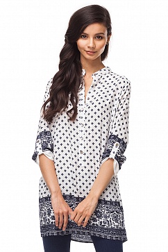 Блузка-туника свободного силуэта с цветочным принтом в этническом стиле. Укороченный рукав 3/4 с расклешением фиксируется на пату с застежкой на пуговицу. Воротник стойка, застежка на планку с пуговицами из натурального перламутра.