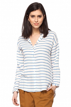 Блузка свободного силуэта со спущенным плечом изготовлена из тонкого вискозного принтованого полотна с небольшим добавлением нейлона для уменьшения сминаемости ткани. Классический отложной воротник, застежка на планку на пуговицах. Накладные карманы. Удлиненная спинка с широкой двойной кокеткой.