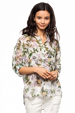 Блуза свободного силуэта из шифона с цветочным принтованным узором. Спущенное плечо, на спинке широкая кокетка со складкой по центру спинки. На рукаве пата, которая позволяет регулировать длину. Воротник отложной на стойке.