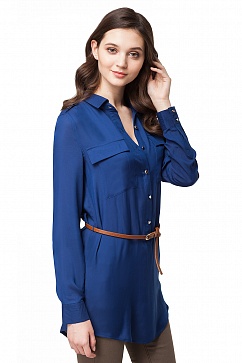 Удлиненная блуза свободного кроя из смешанных волокон вискозы и полиэстера, что обеспечивает не только комфорт, но и меньшую сминаемость ткани. Волокна двух оттенков синего создают эффект перелива "хамелеон". Спереди планка с золотыми пуговицами. Сзади от кокетки спинки отходит складка. На груди накладные карманы. Ремешок входит в стоимость изделия.