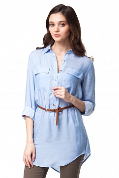 Удлиненная блуза свободного кроя из смешанных волокон вискозы и полиэстера, что обеспечивает не только комфорт, но и меньшую сминаемость ткани. Волокна двух оттенков синего создают эффект перелива "хамелеон". Спереди планка с золотыми пуговицами. Сзади от кокетки спинки отходит складка. На груди накладные карманы. Ремешок входит в стоимость изделия.