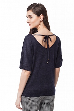 Топ свободного силуэта с заужением к низу изготовлен из мягкого трикотажного полотна. Полотно с эффектом меланж. Спущенное плечо, низ рукава на широкой манжете. На спине глубокий вырез с завязкой на длинные тесемки с металлическими наконечниками.