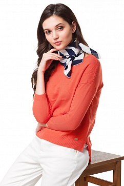 Джемпер свободного силуэта с удлиненной спинкой изготовлен из хлопковой пряжи. Спереди вязка "ромбы", разрезы в боковых швах. Спущенное плечо, рукав 3/4. Снизу металлическая нашивка с логотипом.