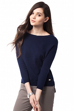 Джемпер свободного силуэта с удлиненной спинкой изготовлен из хлопковой пряжи. Спереди вязка "ромбы", разрезы в боковых швах. Спущенное плечо, рукав 3/4. Снизу металлическая нашивка с логотипом.