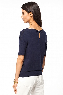 Джемпер свободного силуэта со спущенным плечом связан из эластичного хлопковой пряжи. Укороченный рукав и низ изделия вязан резинкой. На спине декоративный вырез-капля. Низ изделия и рукавов, горловина и плечевой шов вязаны с добавлением в пряжу тонкой люрексной нити.