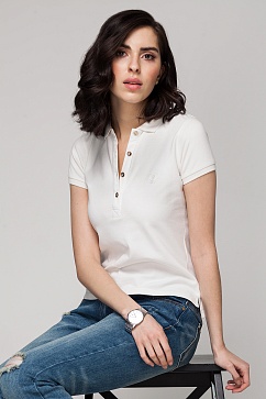 Рубашка- поло классического покроя по фигуре. Спереди планка с золотистыми пуговицами, воротник рубашечный из хлопковой рибаны, так же, как и манжеты на рукавах. Спинка длиннее, чем перед, по бокам внизу небольшие разрезы. Снизу изделия нашит металлически