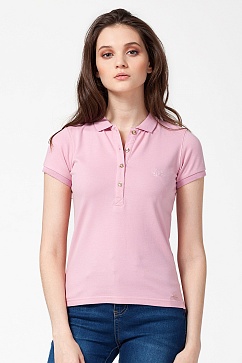 Женская футболка-поло классического покроя по фигуре. Спереди застежка на планку с золотистыми пуговицами. Рубашечный воротник и манжеты из хлопковой рибаны. Удлиненная спинка, внизу по бокам небольшие разрезы. Снизу изделия нашит металлический логотип.