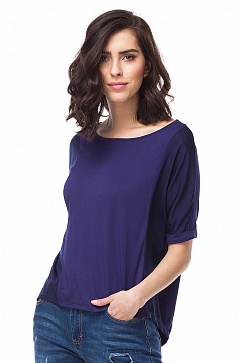 Футболка свободного кроя выполнена из двух видов ткани: перед и спинка изделия - вискозный трикотаж, по бокам вставки из плотного полуматового атласа. Сзади на горловине нашит металлический логотип.