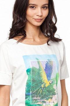 Футболка из эластичного хлопкового полотна. Широкий свободный силуэт, на рукавах узкие манжеты с посадкой плотно по руке. Яркий летний принт дополнен прозрачными пайетками.