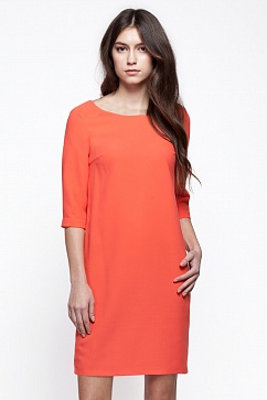 Платье прямого силуэта из плотной креповой ткани атласной внутри. Без подкладки. Сзади глубокий V-образный вырез с горизонтальными параллельными полосками из основной ткани. Рукава до локтя на узкой манжете с застежкой на пуговицу.