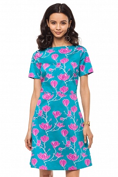 Эффектное летнее платье из эластичного хлопкового сатина, перепление которого придает атласный отлив изделию. Приталенный силуэт изделия с юбкой-трапецией, сзади застежка на потайную молнию.