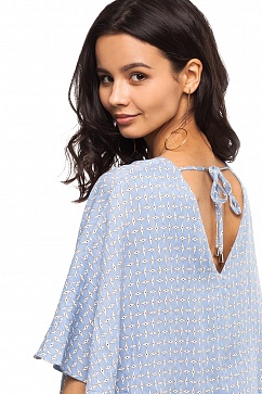 Романтичное платье свободного покроя выполнено из фактурного вискозного полотна с геометрическим принтом. Изюминка платья - глубокие V-образный вырезы и драпированные расклешенные рукава с эффектом пелерины.