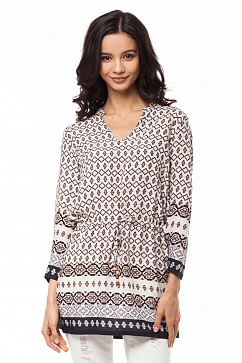Платье-туника из вискозного штапельного полотна с купонным рисунком по низу и рукавам. На талии кулиса со шнурком, концы которого украшены декоративными бусинами. В больших размерах длина платья увеличивается и доходит до колена.