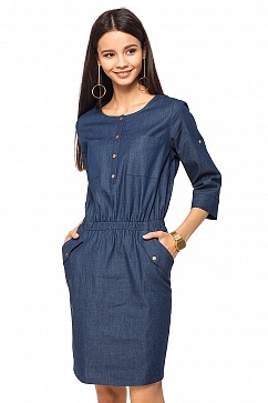 Платье прямого силуэта с резинкой на талии выполнено из денима. Округлый вырез горловины, застежка на планку на кнопках. На груди накладные карманы, на юбке наклонные карманы с декоративными клапанами. Рукав 3\4 с манжетой, длина регулируется патой с застежкой на кнопку.