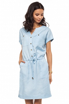 Платье с коротким рукавом выполнено из натурального льняного полотна с добавлением вискозы для придания изделию мягкости. Свободный силуэт, линия талии подчеркнута кулиской с завязкой на шнурок. Прекрасный вариант для повседневного летнего гардероба.