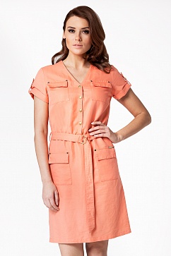 Платье из натуральных волокон льна и хлопка. Полуприлегающий силуэт обеспечивает пояс и резинка на талии. Накладные карманы с клапанами на груди и бедрах. Углы клапанов украшены золотистыми заклепками, на левом кармане лого. Полочки застегиваются на золотистые кнопки. Пояс фиксируется сзади широкой шлевкой, закрепленной заклепкой. По спинке от кокетки - бантовая складка. Рукав с отложной манжетой. Длина рукава регулируется застёжкой на пату.