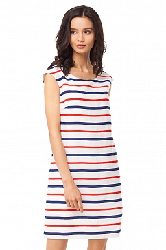 Платье изготовлено из плотного мягкого вискозного полотна с принтованным трехцветными полосами. Платье А-силуэта с небольшим расклешением к низу. Сзади V-образный вырез горловины с широкой перемычкой в верхней части. В больших размерах длина платья увеличивается и доходит до середины колена.