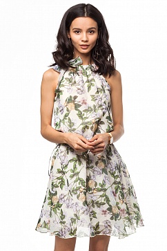 Романтичное платье из матового шифона с нежным цветочным узором. Изделие на хлопковой подкладке. Американская пройма, горловина собрана на завязку-бант. Юбка с клиньями, расклешенная к низу.
