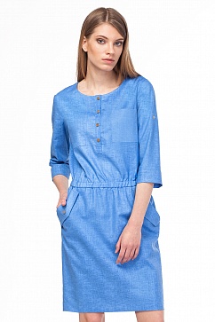 Платье из льняной ткани, обработанной специальной пропиткой , которая придает эффект блеска и предотвращает сильную сминаемость. Прямой силуэт с резинкой в талии. На груди накладные карманы, на юбке наклонные карманы с клапанами, которые закреплены отделочной кнопкой. Застежка на планку с четырьмя плоскими золотыми кнопками-таблетками. Рукав 3\4 с манжетой, с хлястиком , который позволяет фиксировать подвернутый рукав. На спинке фигурная кокетка.