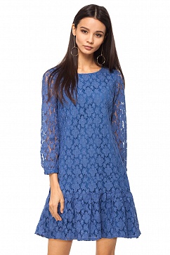 Платье свободного силуэта с широкой оборкой на юбке с заниженной талией. Изделие выполнено из кружевного полотна с цветочным узором. Изделие на тонкой хлопковой подкладке. Рукава 3/4 собраны на манжеты с застежкой на пуговицу. Застежка сзади на потайную молнию.