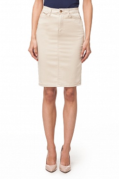 Юбка изготовлена из плотной хлопковой эластичной ткани. Классический джинсовый покрой, спереди застежка на пуговицу и гульфик на молнии. Сзади фигурная кокетка с декоративными швами.