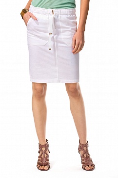 Юбка прямого силуэта выполнена из плотной смесовой ткани хлопка и льна. Цельнокроеный пояс на кулиске с широкой резинкой и атласной лентой. Спереди накладные фигурные карманы, сзади карманы с листочкой. Застежка на потайную пуговицу и гульфик на молнии.