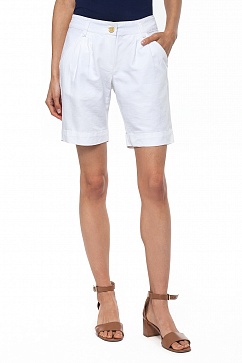 Шорты изготовлены из плотного хлопково-льняного полотна саржевого переплетения. Притачной пояс с застежкой на металлическую золотистую пуговицу. Спереди - боковые карманы с отрезными бочками, у пояса заложены складки. Сзади - прорезной карман с листочкой. Штанины заканчиваются манжетами, закрепленными по бокам.