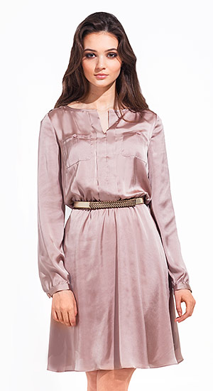 Коктейльное платье изготовлено из полуматового атласа. Изделие свободного силуэта, на талии собрано на резинку. Юбка свободная с расширением книзу, длина за колено. Платье на подкладке из тонкого атласного трикотажа.