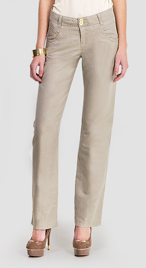 Брюки выполнены из плотной натуральной ткани - лен с хлопком. Спереди и сзади фигурная кокетка с двойной отделочной строчкой. Спереди "джинсовые" карманы, с декоративно отстроченными выточками. Сзади прорезные карманы в рамку, мешковина закреплена фигурной отделочной строчкой. Спереди на поясе 2 золотистые пуговицы.