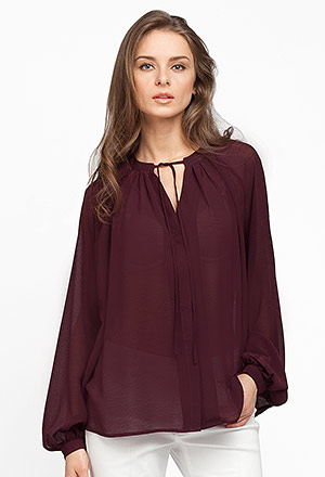 Блузка из фактурного полупрозрачного шифона. Свободный силуэт, сборка вокруг горловины и манжет, множественные мягкие драпировки, завязка на стойке и др. детали создают современный силуэт в стиле 70-х.