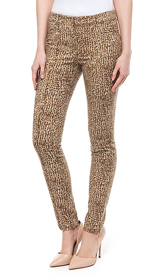 Брюки выполнены из плотной эластичной хлопковой ткани. Спереди и сзади на штанинах вертикальный шов, с отделочными строчками по краям. Прорезной карман с листочкой на передней половинке, сзади - имитация карманов "в рамку". В нижней задней части шва штанины вставлена декоративная золотистая молния.
