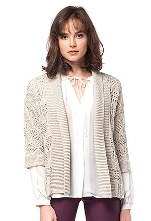 Жакет крупной фактурной вязки выполнен из мягкой шерстяной пряжи натурального цвета. Силуэт прямой, рукав 3/4, без застежки.