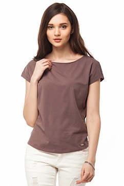 Топ свободного покроя со спущенным плечом изготовлена из тонкого эластичного полотна "кулирка". Широкий вырез лодочкой. Внизу декоративная металлическая нашивка с логотипом.