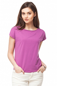 Топ свободного покроя со спущенным плечом изготовлена из тонкого эластичного полотна "кулирка". Широкий вырез лодочкой. Внизу декоративная металлическая нашивка с логотипом.