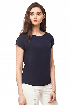 Топ свободного покроя со спущенным плечом изготовлена из тонкого эластичного полотна "кулирка". Широкий вырез лодочкой. Внизу декоративная металлическая нашивка с логотипом.