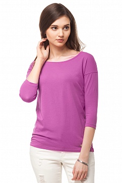 Удлиненная футболка свободного покроя с заужением книзу изготовлена из тонкого эластичного полотна "кулирка". Широкий вырез лодочкой. Спущенное плечо, облегающий рукав 3/4. Внизу декоративная металлическая нашивка с логотипом.