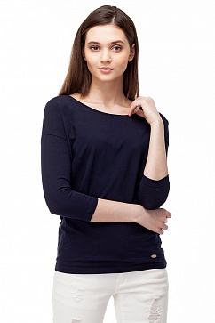 Удлиненная футболка свободного покроя с заужением книзу изготовлена из тонкого эластичного полотна "кулирка". Широкий вырез лодочкой. Спущенное плечо, облегающий рукав 3/4. Внизу декоративная металлическая нашивка с логотипом.