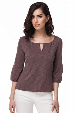 Блузка приталенного кроя выполнена из хлопковых нитей разной толщины, которые придают фактурность ткани. Круглый вырез горловины спереди декорирован серебристыми бусинами в этническом стиле. Широкий рукав реглан 3/4 снизу собран на бейку.