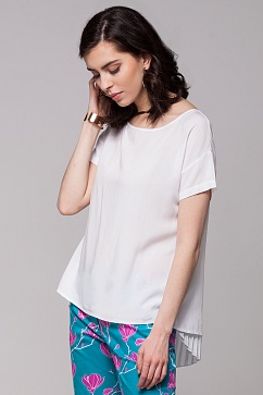 Яркая блузка свободного силуэта из мягкого вискозного полотна станет отличным вариантом на каждый день. Особенность изделия - эффектная удлиненная спинка с запАхом и плиссированной вставкой из плотного шифона.