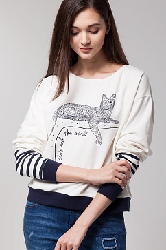Джемпер изготовлен из высококачественного эластичного хлопчатобумажного футера. Низ изделия и манжеты на рибане контрастного цвета, горловина с обтачкой. Перед изделия декорирован принтом и цветными стразами.