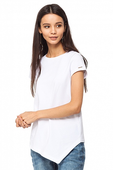 Удлиненная футболка с асимметричным низом выполнена из хлопкового полотна с фактурным плетением. Короткий втачной рукав декорирован металлической нашивкой с логотипом.