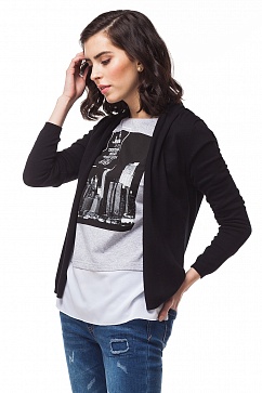 Жакет из тонкой вискозной пряжи. Спереди широкие планки переходящие в ворот-шаль. По низу рукавов манжет, связанный эластичной резинкой.