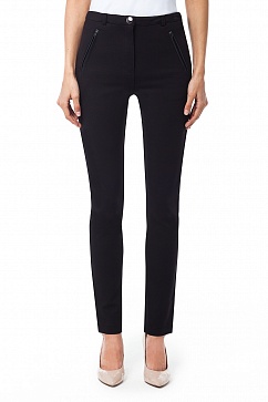 Брюки из плотного эластичного джерси. Спереди карманы на молнии, декорированные искусственной кожей. Сзади ложные карманы в рамку. Застежка на пуговицу и гульфик на молнии.